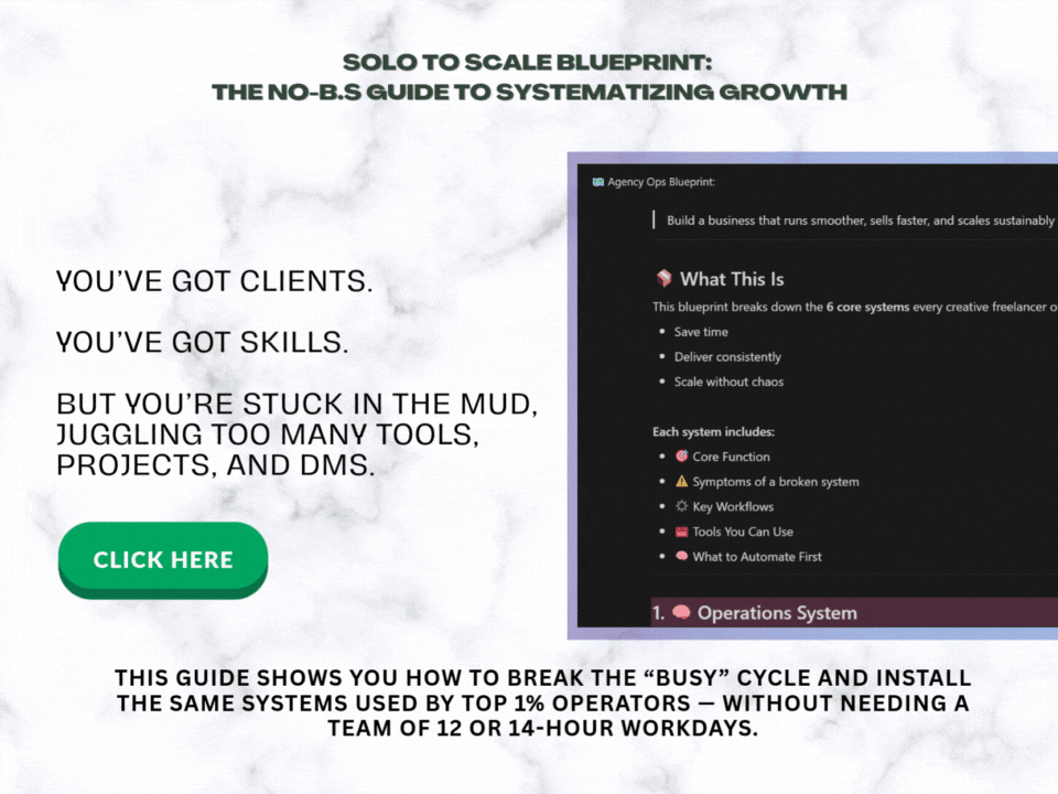 This blueprint gives you a proven roadmap to go from “solo and scrambling” → to structured, scalable, and systematized — without burnout or busywork, using the same systems top 1% creators + operators rely on.