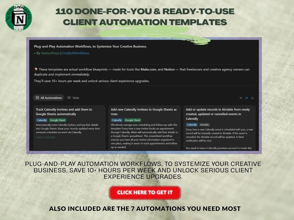 That’s why I built the 110 DFY Client Automations Templates Pack — a plug-and-play library of pre-built automation blueprints you can install, tweak, and launch in minutes.
